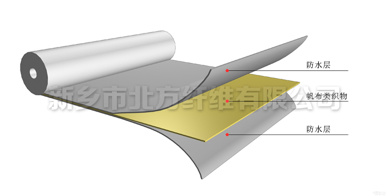 蓬蓋織物的結(jié)構(gòu)類似于"三明治",即以帆布類織物作為骨架材料,在帆布的上下兩面涂覆防水層。帆布在其中起骨架作用并承擔(dān)力學(xué)性能,上下兩面的涂覆層承擔(dān)防水作用。