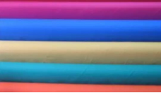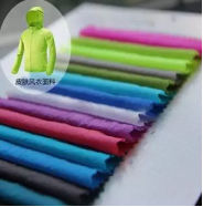 此面料經(jīng)緯均采用20D錦綸按380T規(guī)格在噴水織機上織造,經(jīng)染色,特殊后整工藝而成,該面料克重55g,微皺,手感柔軟,輕薄耐磨,具有防潑水,防風,防紫外線等功能。
