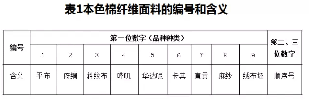 本色棉纖維面料的編號由三位數(shù)字構成。第一位數(shù)字表示品種類別,第二、三位數(shù)字表示順序號。