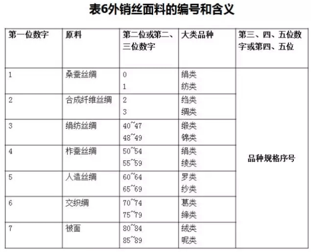 外銷絲面料的編號由五位數(shù)字組成。第一位數(shù)字表示絲面料的原料,分別以“1、2、3、4、5、6”表示,“7”表示被面;第二位數(shù)字或第二、三位數(shù)字分別表示絲面料所屬大類的類別;第三、四、五位數(shù)字或第四、五位數(shù)字表示品種規(guī)格序號。
