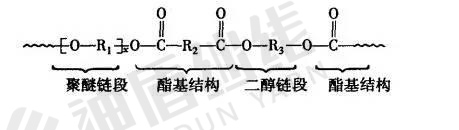 聚醚酯彈性纖維是由聚酯和聚醚共聚物通過熔融紡絲制得的彈性纖維,日本帝人公司于 1990 年首次生產(chǎn)。聚醚酯彈性纖維與聚氨酯彈性纖維結(jié)構(gòu)類似,也具有“區(qū)段”結(jié)構(gòu)特征?!败洝辨湺沃饕蔷勖焰湺?,柔軟性好,鏈較長(zhǎng),容易伸長(zhǎng)變形;“硬”鏈段則是聚酯鏈段,相對(duì)較僵硬,易于結(jié)晶,鏈較短,在纖維受力變形時(shí)起節(jié)點(diǎn)作用,賦予彈性回復(fù)性能,并決定纖維的強(qiáng)力和耐熱性。