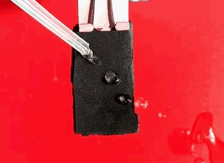 圖4 不沾不濕,水滴一抖即落的電磁屏蔽材料(圖中黑色是超疏水的電磁屏蔽材料,黑色上面的物質(zhì)是灰塵,用水一沖立即干凈)