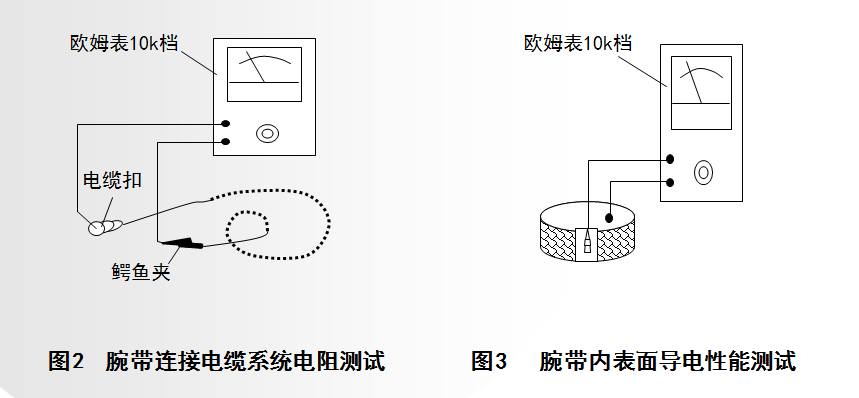 腕帶內(nèi)表面(與手腕的接觸面)對(duì)腕帶線端電阻應(yīng)不大于1×105Ω,供連接腕用的腕帶連線端對(duì)端之間的電阻為7.5×105~6×106Ω 。