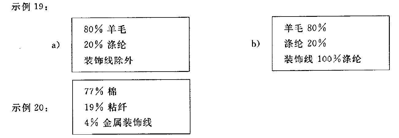 6 .12在產(chǎn)品中存在易于識(shí)別的花紋或圖案的裝飾纖維或裝飾紗線(若拆除裝飾纖維或紗線會(huì)破壞產(chǎn)品的結(jié)構(gòu)),當(dāng)其纖維含量≤5%時(shí),可表示為“裝飾部分除外”,也可單獨(dú)將裝飾線的纖維含量標(biāo)出(見(jiàn)示例19)。如果需要,可以表明裝飾線的纖維成分及其占總量的百分比(見(jiàn)示例20)。