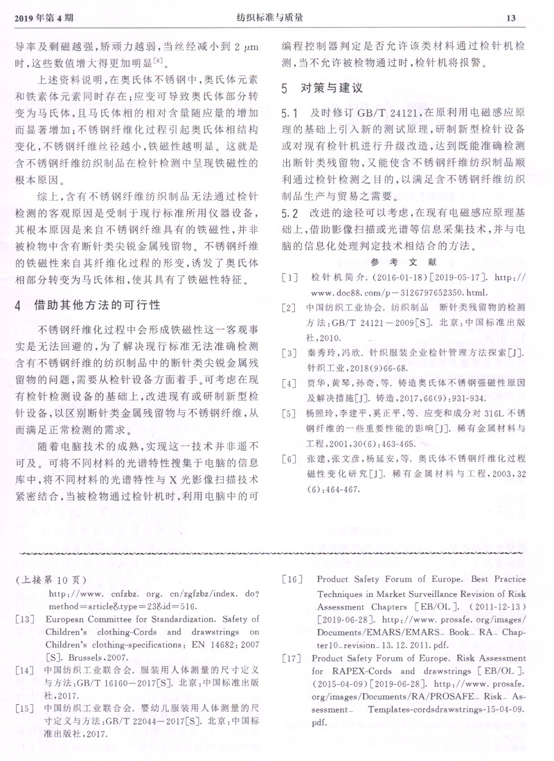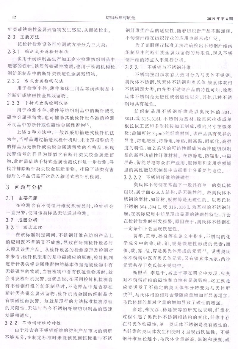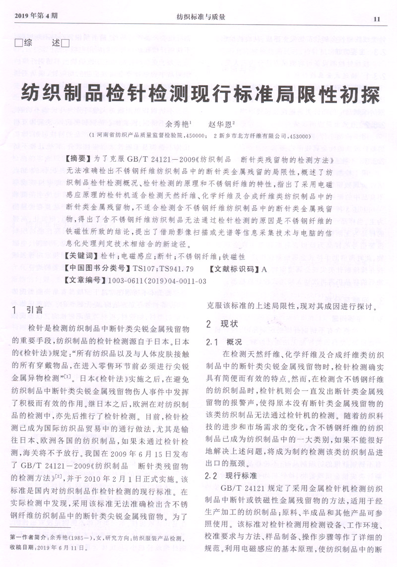 2019年8月25日出版的《紡織標(biāo)準(zhǔn)與質(zhì)量》(A類學(xué)術(shù)期刊)2019年第四期發(fā)表的“紡織制品檢針檢測現(xiàn)行標(biāo)準(zhǔn)局限性初探”一文,從紡織制品檢針檢測概況、檢針檢測的原理和不銹鋼纖維的特性諸方面分析、較為全面的探討了其原因。