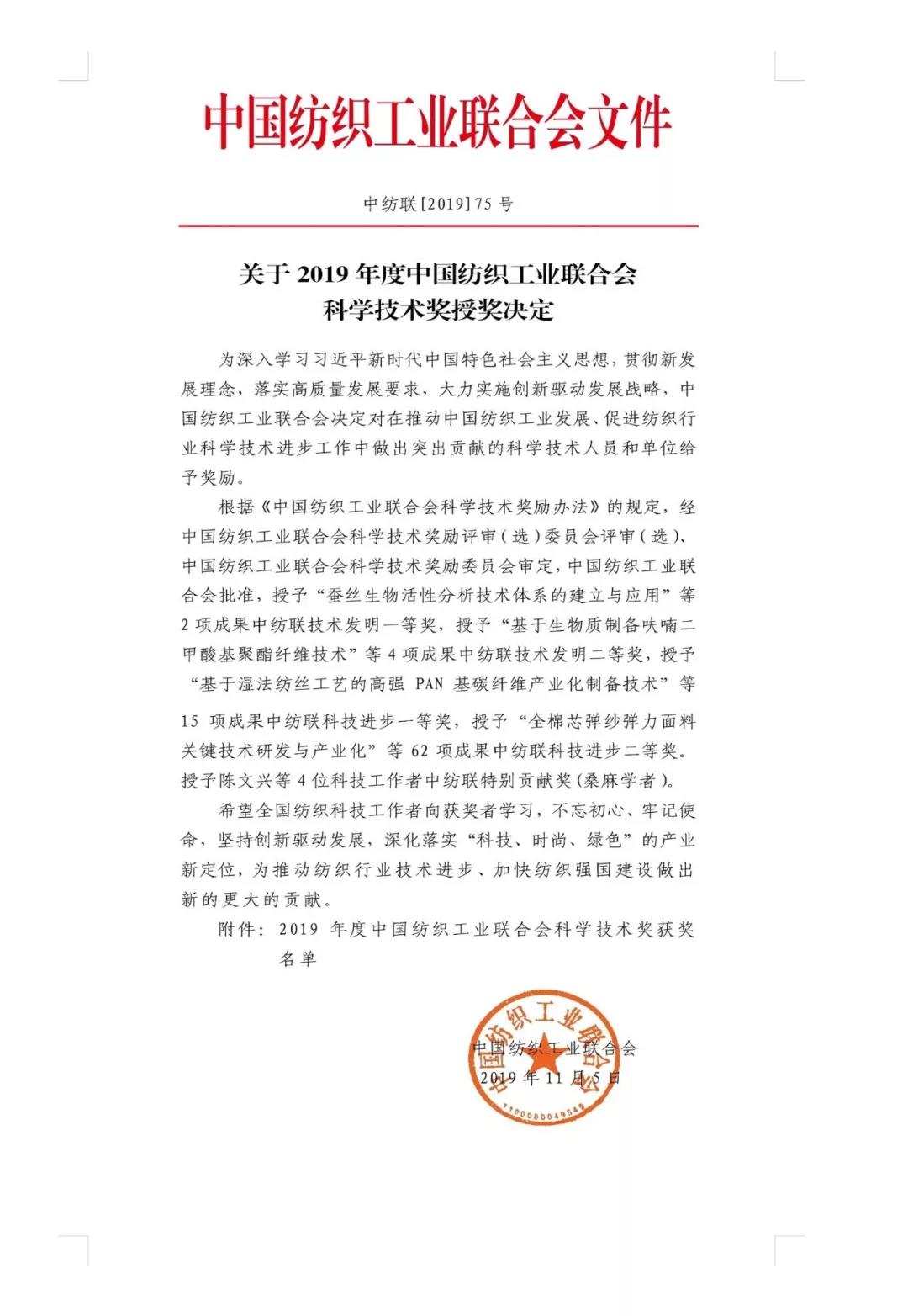 12月6日下午"紡織之光"2019年度中國紡織工業(yè)聯(lián)合會科技教育獎勵大會在莊嚴的北京人民大會堂隆重召開。