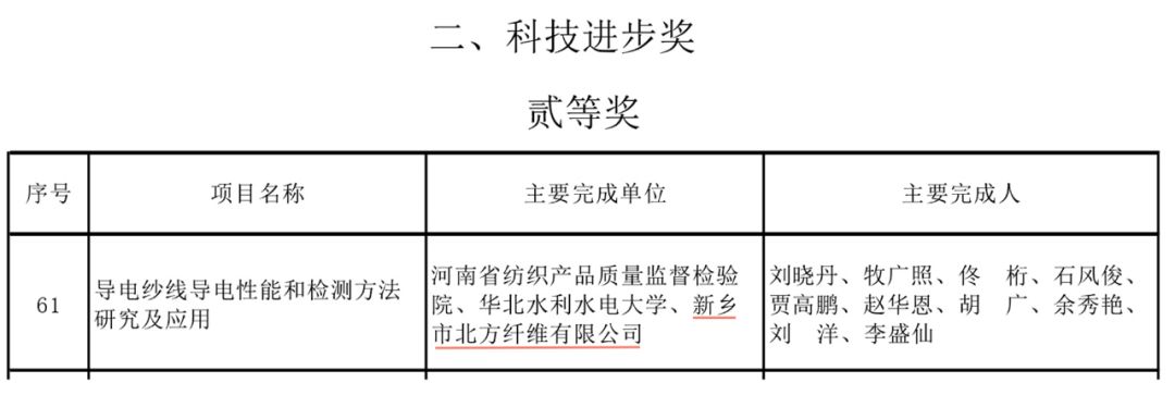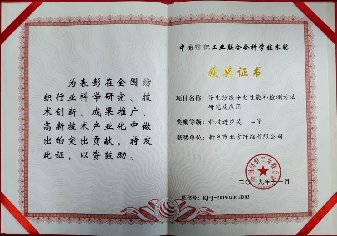 新鄉(xiāng)市北方纖維有限公司與河南省紡織產(chǎn)品質量監(jiān)督檢驗院、華北水利水電大學合作的"導電紗線導電性能和檢測方法研究及應用"獲:紡織之光科技進步二等獎。