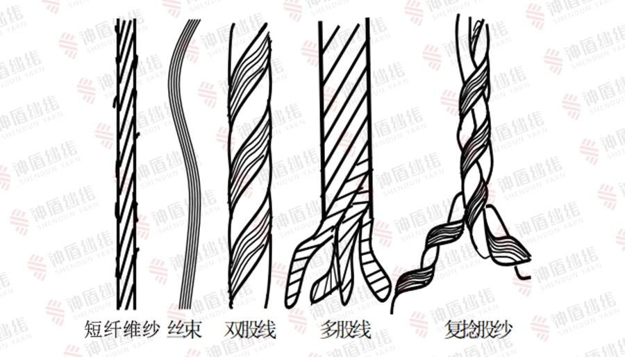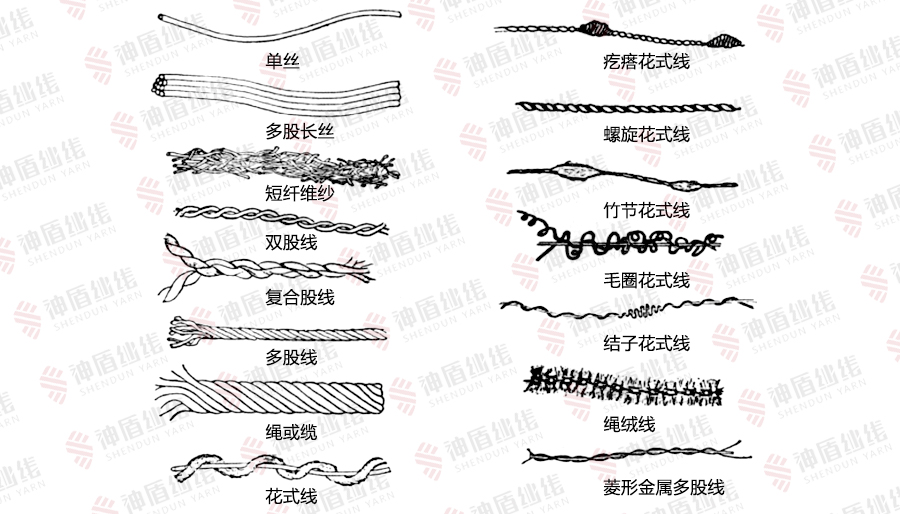 單紗、股線、單絲、復(fù)絲、膨體紗、變形紗、包芯紗、花式紗線、竹節(jié)紗、無捻紗、包纏紗等。