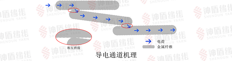 纖維混紡導(dǎo)電紗的導(dǎo)電機(jī)理有三種,即:導(dǎo)電通道機(jī)理、隧道效應(yīng)機(jī)理、場(chǎng)致發(fā)射機(jī)理。