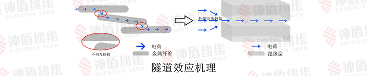 電紗線中,金屬纖維之間不能相互搭接,但其間距較小,無(wú)法形成鏈狀導(dǎo)電通道的情況下,外加電壓較低時(shí),隧道效應(yīng)導(dǎo)電機(jī)理起主導(dǎo)作用;