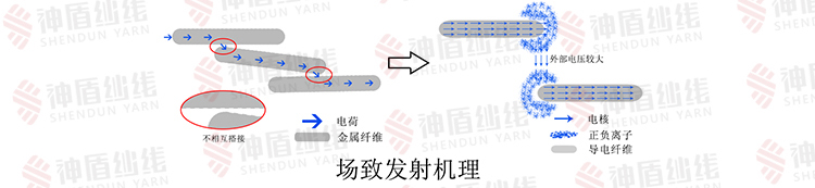電紗線中,金屬纖維之間不能相互搭接,但其間距較小,無(wú)法形成鏈狀導(dǎo)電通道的情況下,外加電壓較高時(shí),場(chǎng)致發(fā)射導(dǎo)電機(jī)理起主導(dǎo)作用。